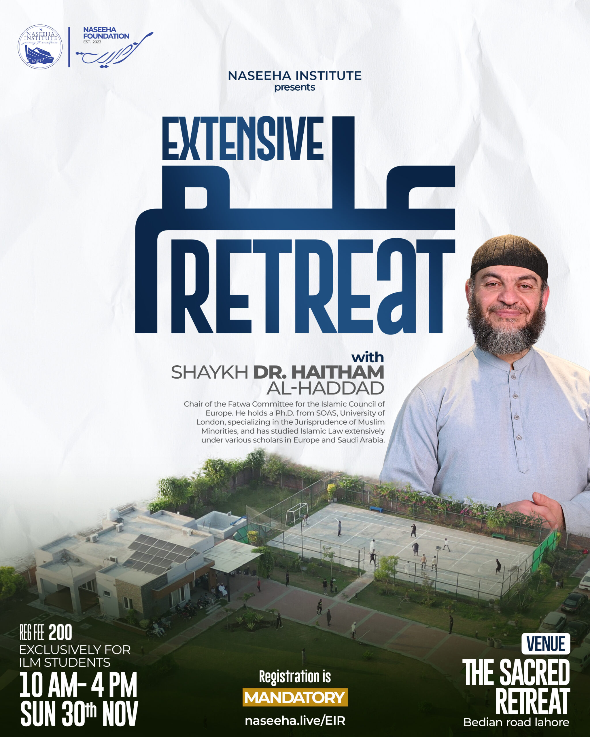 Join Shaykh Dr. Haitham Al-Haddad for the Extensive ‘Ilm Retreat, an exclusive one-day intensive session focused on Maqasid al-Shari’ah (Objectives of Islamic Law). Held at The Sacred Retreat, Lahore, this event is designed specifically for ‘Ilm students seeking a deeper, specialized understanding of Islamic Law.